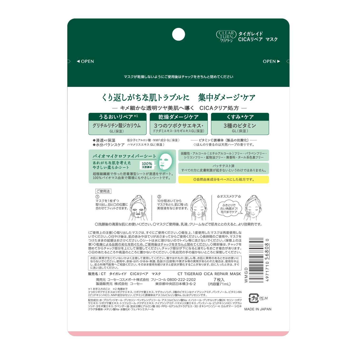 Clear Turn KOSE CICA Repair Mask 7-Piece Face Pack Moisturizing